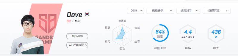 中单Dove最近的表现比较一般,对于支援和节奏型英雄的理解一直都比较独到,因此有很多队伍都在针对他的英雄池,像瑞兹这样既能单带又能支援后期输出还不俗的英雄就很难被放出来。数据方面,4.4的KDA、436的DPM和111%的伤害转换率相比于对手的ShowMaker无论是伤害能力还是赛场表现都要逊色一些,但70%的参团率则恰恰体现了他的打法,在支援方面无疑要强于对手一些。