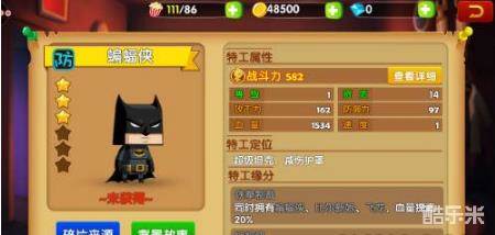 蝙蝠侠是一个14资质的防属性英雄,在技能方面上,