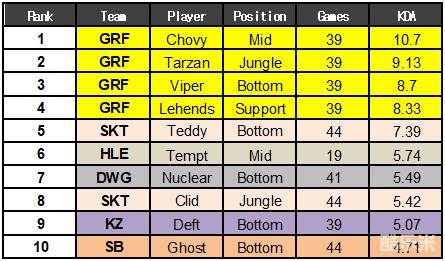 同时拳头还公布了春季赛中KDA的排行榜。上单位置KDA最高的选手是SKT战队的Khan,他的KDA为4.15。其余所有位置的MVP第一名都归属于格里芬战队。分别是打野的Tarzan,中路的Chovy,下路的Viper以及辅助的Lehends。这些KDA第一名将获得200万韩元的奖励。