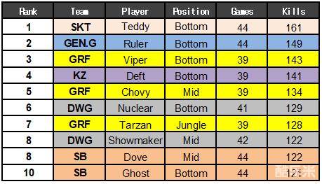 除了上述奖项之外,还有一些比较有趣的排名。例如击杀最多的选手是SKT T1的下路选手Teddy,他在44场比赛中总计收获了161次击杀。排在他后面的分别是Ruler以及Viper的149次和143次击杀。