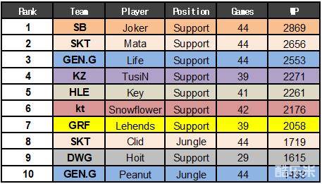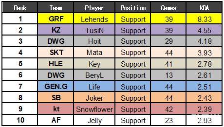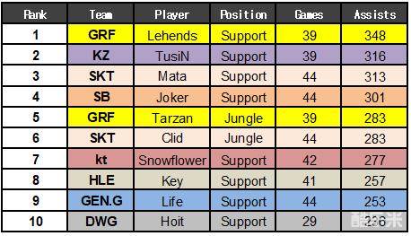 如同位置的名字一样,排在助攻榜前列的都是辅助选手。格里芬的辅助Lehends以348个助攻高居第一。第二名是KZ战队的辅助Tusin的316次助攻,SKT T1的辅助Mata以313个助攻位列第三。