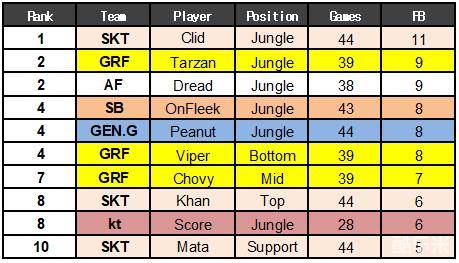 拿到一血最多的基本上都是各个队伍的打野选手,因为他们会积极地在地图周围游走。SKT T1的Clid以11次一血位居第一。格里芬的Tarzan和AFS的Dread则均以9次一血位列第二。