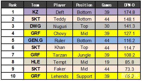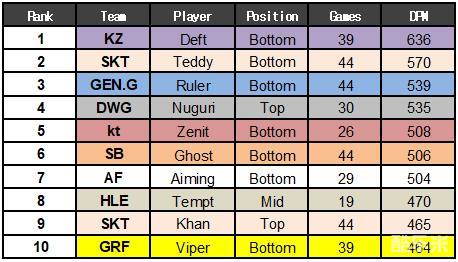 分均伤害最高的选手基本上都来自下路。KZ战队的下路选手Deft每分钟可以造成636点伤害冠绝LCK。紧随其后的是570点伤害的Teddy以及Ruler的539点伤害。比较值得注意的是DWG战队的上单Nuguri每分钟伤害高达539位列第四。而Deft和Teddy同时还是每分钟输出超过对手最多的选手,这项数据中第三名依然是Nuguri。