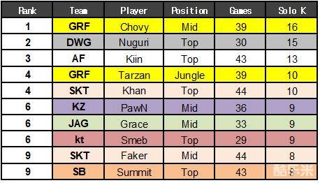 常规赛MVP以及KDA第一的Chovy是单杀最多的选手。他获得了16次单杀领先与第二名Nuguri的15次。AFS的上单Kiin有13次单杀,而Khan和Tarzan以10次单杀并列第四。紧随其后的是KT上单Smeb的9次单杀。