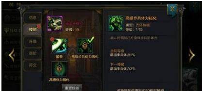 2、高级步兵体力强化:战斗时增加己方全体步兵的体力,技能一级时增加步兵体力1%,下一级增加至2%。