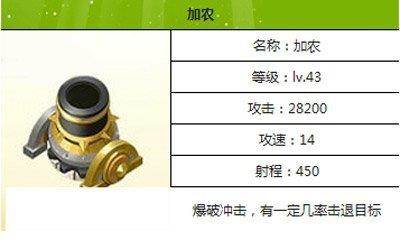 最后编辑于6年前加农炮等级是43级哦,攻击力达到了28200,攻击速度是14,射程是450。仅从参数上来看,这还是一款不错的大炮。其实在前期小伙伴们好用的炮塔并不是很多,而且基本都是一星的炮塔,很不给力,不过在开启寻宝之后小伙伴第一寻宝都抽到了一直二星的炮塔吧。作为精良炎魔,这可是小伙伴们在前期最给力的输出了。