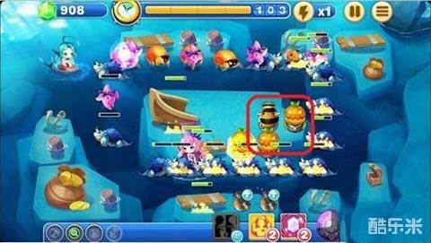 为加快速度清理障碍物,需要多建造一个南瓜炮塔(如下图所示)。当船头被打破后,开始升级周边的炮塔,此时,所有炮塔同时开攻,清理怪物。