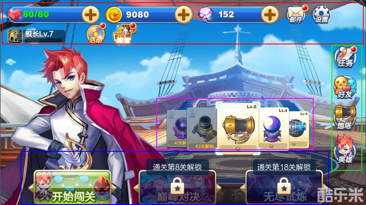在这个区域,有【任务】、【好友】、【炮塔】、【英雄】四个图标