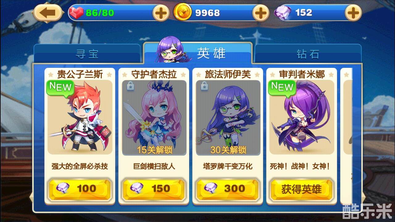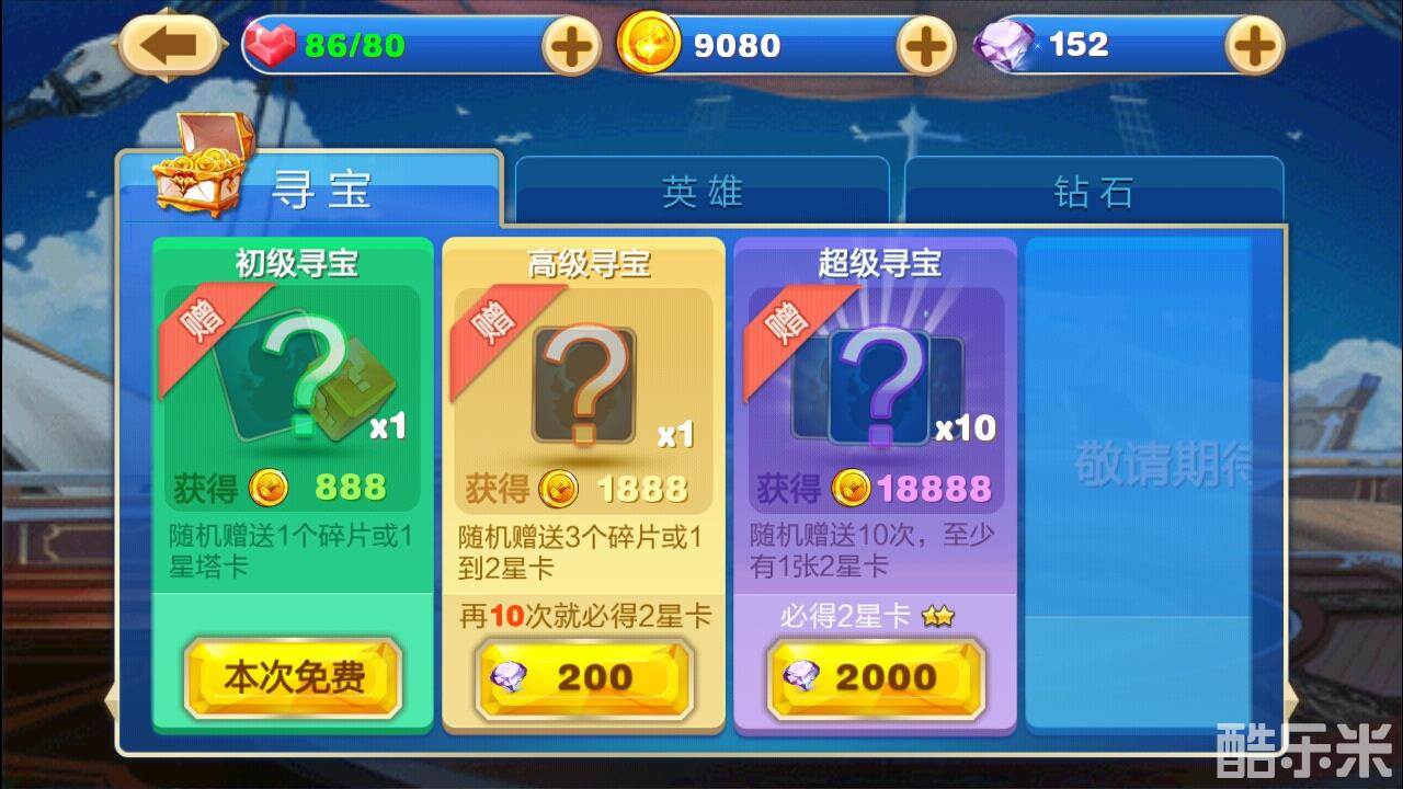 【寻宝】:每天有一次免费的机会,其他时候嘛,呵呵,你懂的。也可以在这个界面购买英雄或者钻石。当然,稀有英雄“审判者米娜”只能能通过寻宝得到噢!