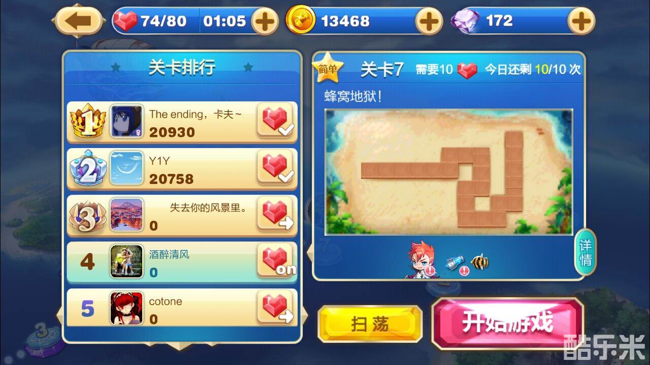 注意到上图中的“简单”两个字没?说明这是简单难度的,还有跟多难度的哦。那个带着皇冠,下面写着"TOP"的就是你的好友中,在这片区域得分最高的人。只有打通一关后才能进入下一关,不然后面的关卡都是带锁的。