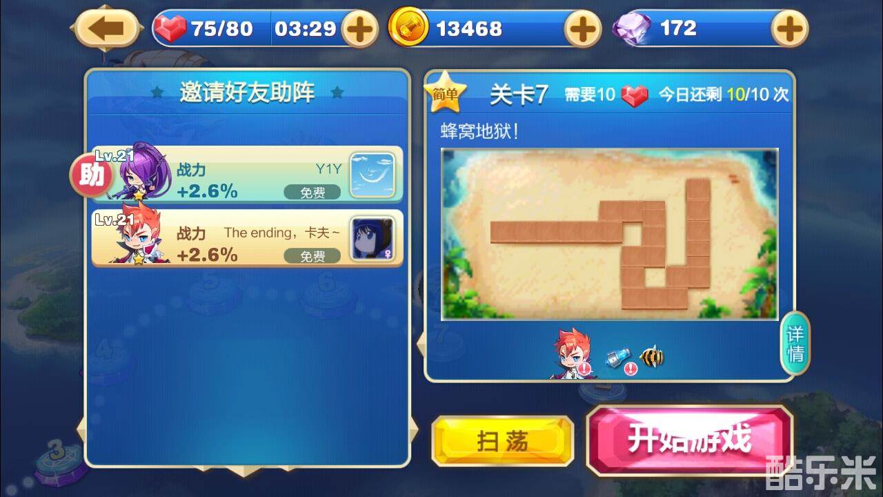 了解完关卡信息,做好了充足的准备后,就可以点击“开始游戏”了。就会来到一个新界面,这也是游戏的一个特色:好友助阵。在这里你可以选择召唤你的小伙伴到关卡中帮你(一次只能召唤一个噢!)