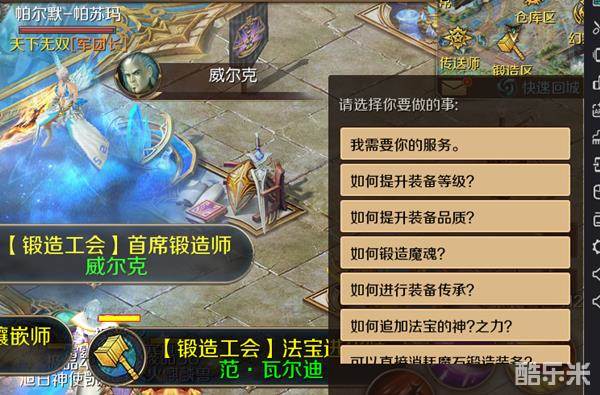 如图所示,想要进行装备养成,你首先要找到锻造工会这几位大师。一般来说,强化装备的部分都集中在首席锻造师身上。在他这里,你可以提高装备等级,提高装备品质,以及提高装备追加数。他旁边的融合镶嵌师则可以帮助你将宝石镶嵌到装备的孔洞里。