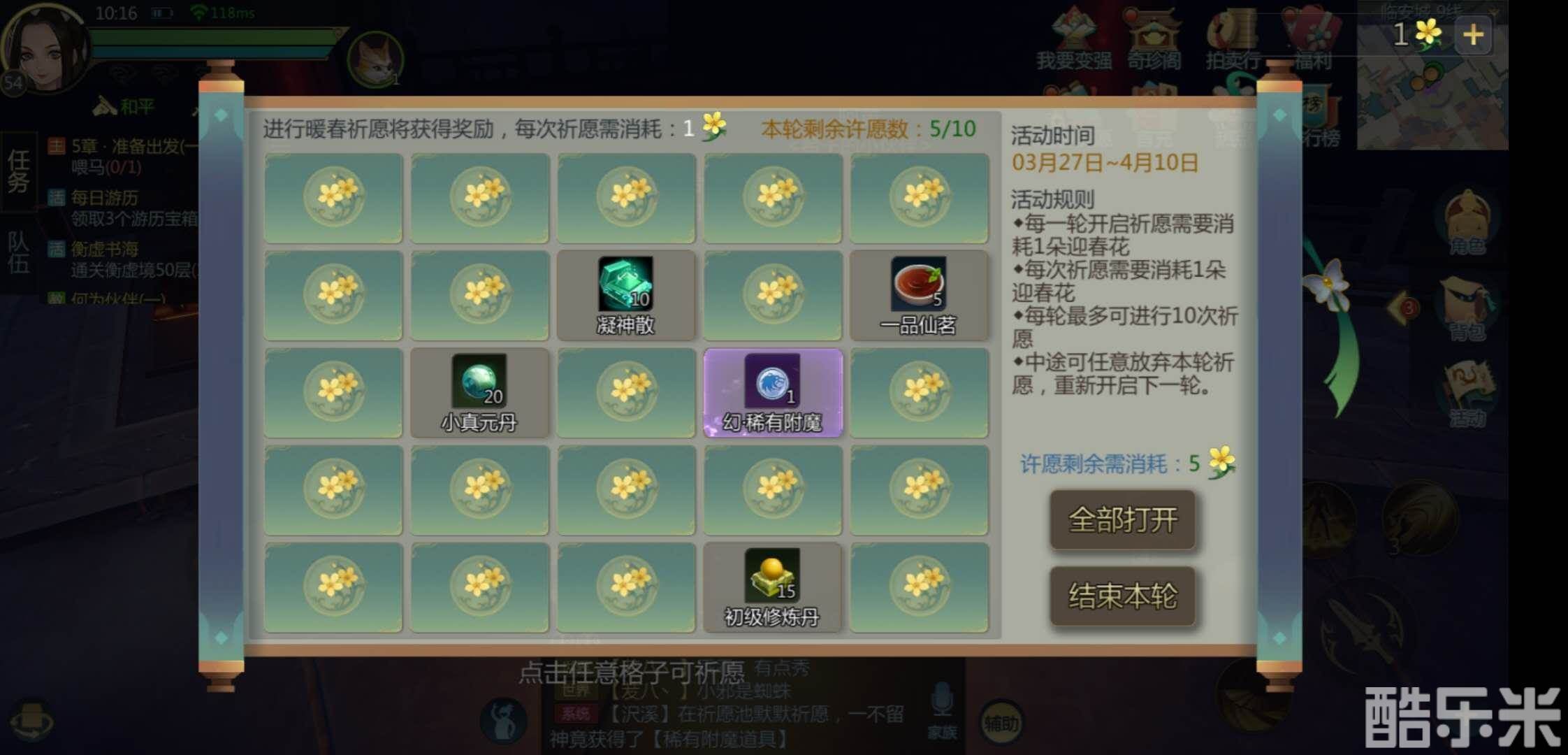 关于参加暖春祈愿活动的活动道具【迎春花】,少侠们可以通过开启游历宝箱、通关衡虚境最高层、也可以通过元宝购买更多,奇珍阁每天前20个迎春花可享受7.5折优惠。