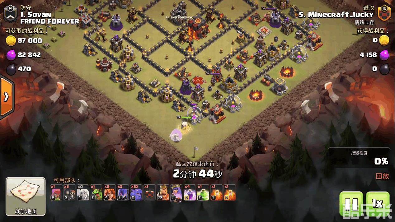 在图中实例中,根据该阵型,我们选择第一阶段的天女从 6 点钟位置放兵,并在女王右侧放下龙宝断边,让女王一路向左滑步,沿路清理掉女王连弩和沿途其他建筑。当女王滑步至地图左侧时,我们接上第二阶段的作战,用皮卡超人、胖子和蛮王在前排抗伤害,炸弹人破墙进圈,武神在狂暴的加持下迅速清理沿途防御和建筑,并在后排搭配两个女巫,利用其不断产生的骷髅兵吸引伤害,为前排血抗缓解压力。蓝胖放置在天女的一边,利用其超远射程,与女王一道组成远程攻击部队,在天使的持续补血下村,清理掉中心建筑。在清理掉中心重点建筑后,兵分两路的部队就可以进行收尾清理了,一场三星胜利稳稳到手。