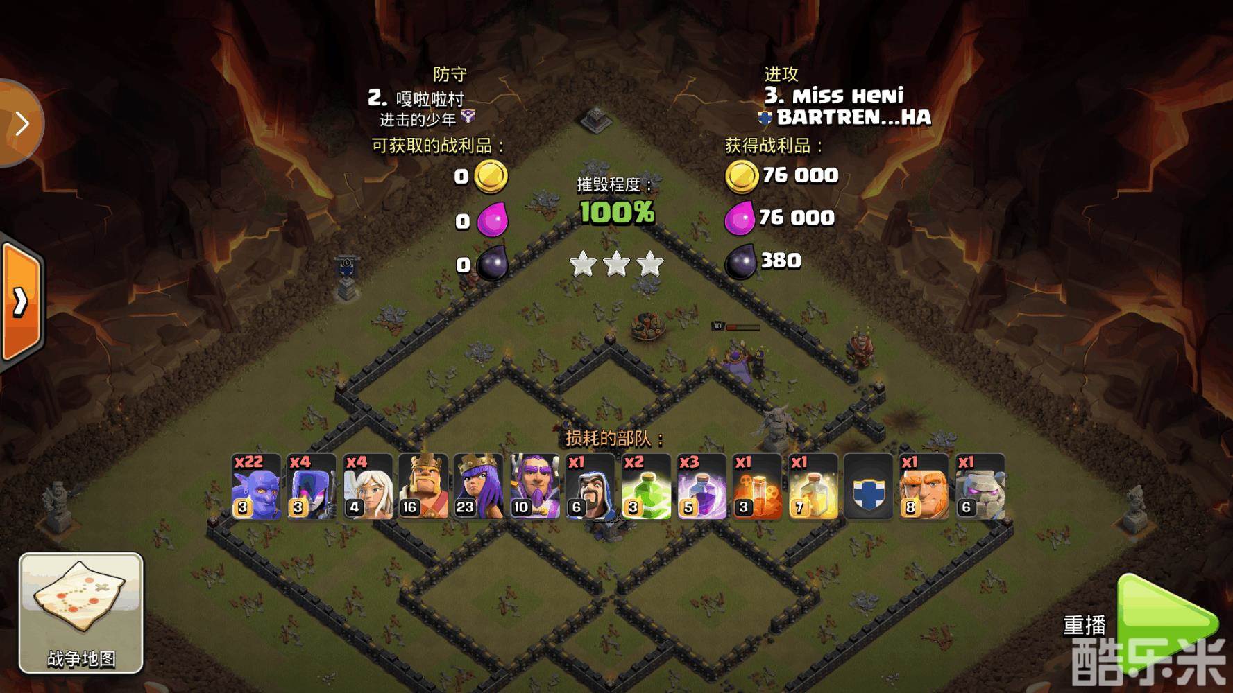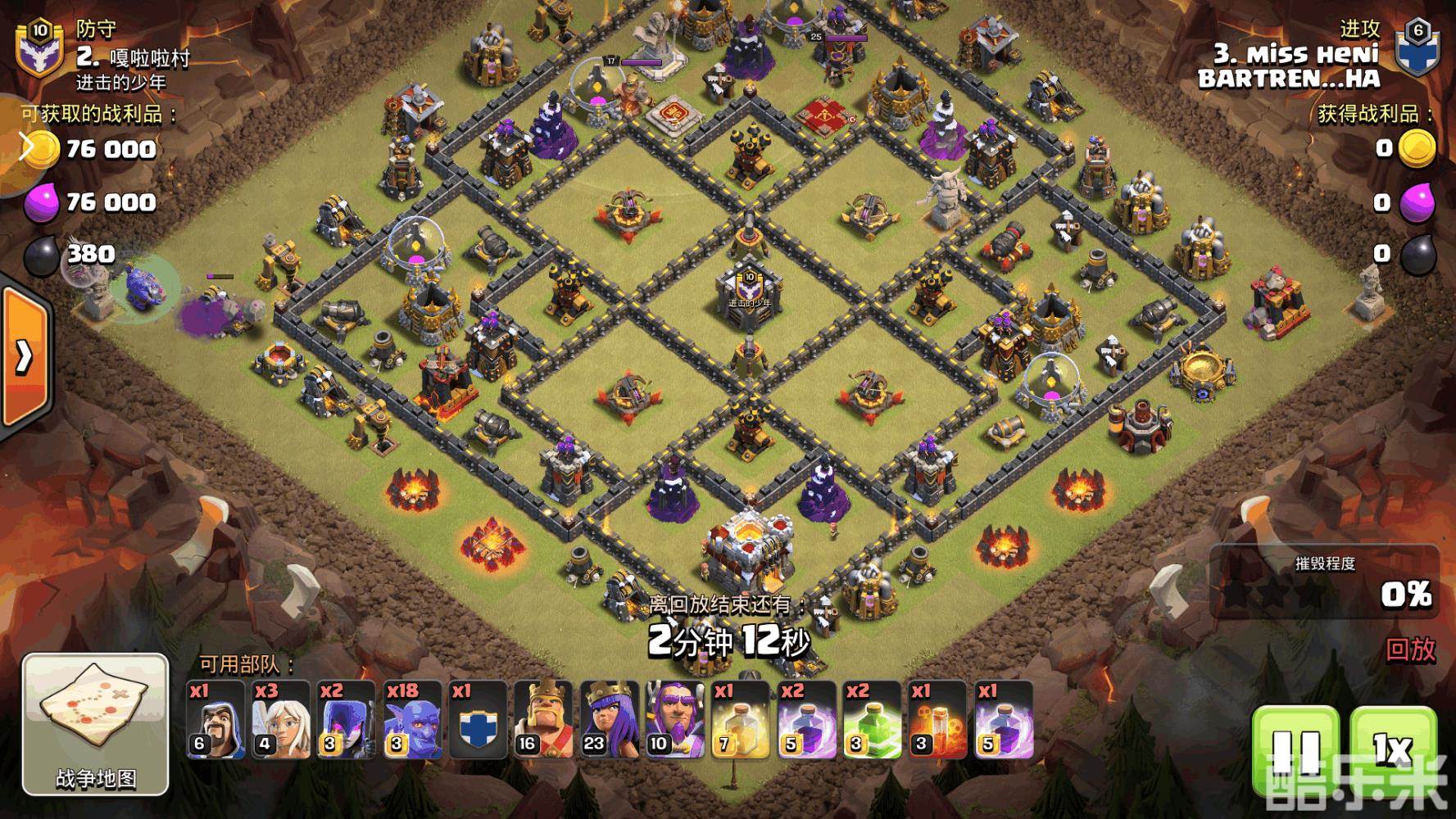 图中实例比较简单,面对的仅仅是一个无地狱塔的十本阵,在女王和蓝胖分别清理完左上左下区域后,利用弹跳开墙成功进中,两路军队汇合进行持续攻击,轻松的取得了三星胜绩,相信大家在熟悉这一流派后在面对满十本和十一本阵型也能取得好的成绩,祝大家玩得愉快!!