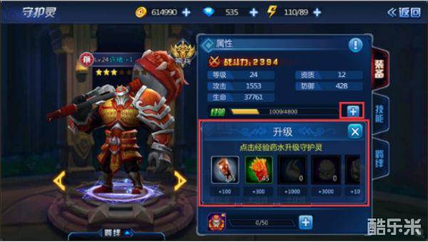 除了进阶装备可以提升守护灵的战斗力外,升级守护灵的技能也可以提高守护灵的伤害哦。随着守护灵的等级提升,玩家可以不断的升级技能。在升级技能前小编要透露一个玩家容易忽略的守护灵等级升级按钮,如下图标红的+号小按钮,点击后即可显示升级守护灵等级的界面啦,点击界面中经验药水可乐、薯条等等就可以升级守护等级啦(这个按钮好多玩家都没发现哟...嘿嘿嘿大家484要感谢我呢!)