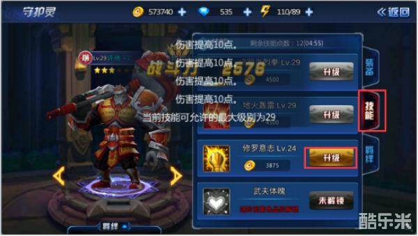 将守护灵等级升级后就可以去升级技能啦,看下图点击“技能”再点击技能界面的“升级”。伤害就这么一次次提升啦!