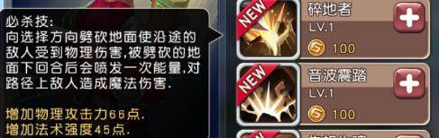 AOE技能,向选择方向劈砍地面使沿途的敌人受到物理伤害,被劈砍的地面在下回合会喷发一次能量,对路径上敌人造成魔法伤害。