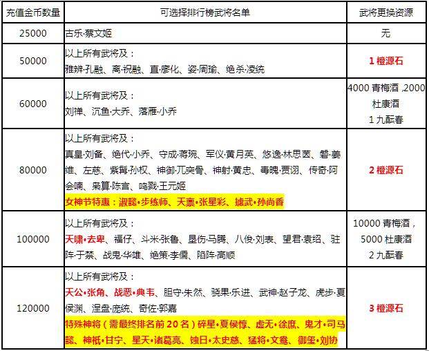 1、活动期间,累计充值金币数量达到对应金额,可以联系在线客服申请1个排行榜武将奖励,或对应金额的进阶酒或橙源石奖励;