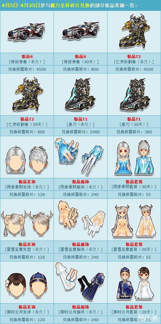 4月5日-4月25日期间,魔力圣杯奖励全面升级,极品S车绝影神驹/炼狱使者、极品T2凌霜圣使等极品奖励等你来,千万不要错过哦!