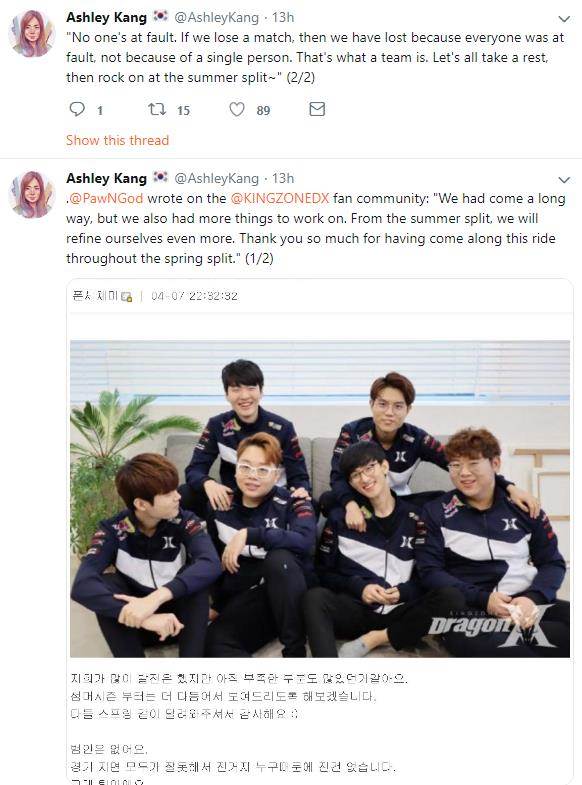 “错误不是属于一个人的。如果我们输了一场比赛,那就是因为我们每个人都犯了错,而不是因为某一个人。这就是团队的本质。让我们大家休息一下,然后在夏季赛继续努力~”