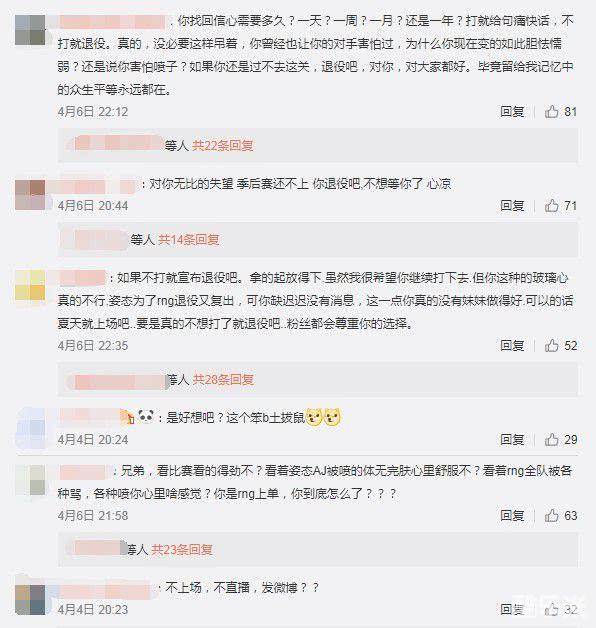 鉴于这个情况,许多RNG粉丝十分着急。不少粉丝跑到正处于休赛期的RNG另一位上单选手Letme的微博上留言,直言“不打比赛就退役”。
