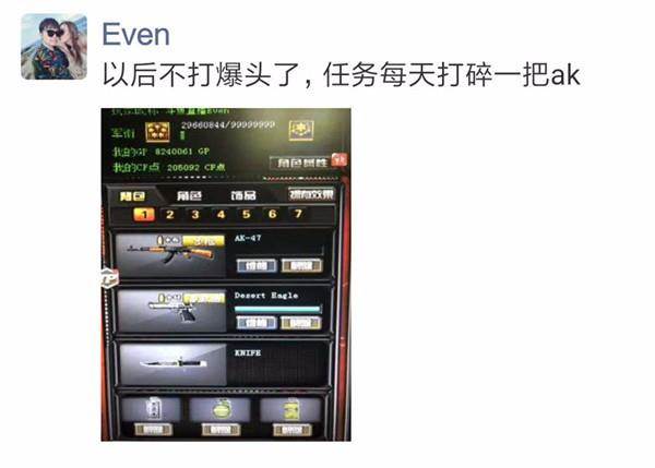 最近的KOC枪王大奖赛正在如火如荼地进行当中,有着很高的个人数据却遗憾在一倍赛就被淘汰的even这两天可没闲着,虽然KOC是不能再继续打了,但是接下来的WCG、CFPL才是重中之重,所以练枪一刻也没停息。一般来说,职业选手除了每天相互训练之外,还有一个独立的个人练枪时间,多数战队会规定每天击杀多少人,或者每天打多少个头,大多数职业选手主要是按爆头计算自己每天的练枪任务,不过最近AK小霸王白鲨Even却有了新的计算方式,那就是一天打碎一把AK47。