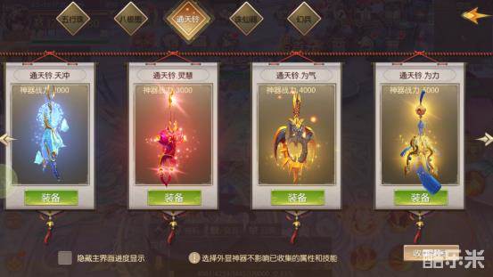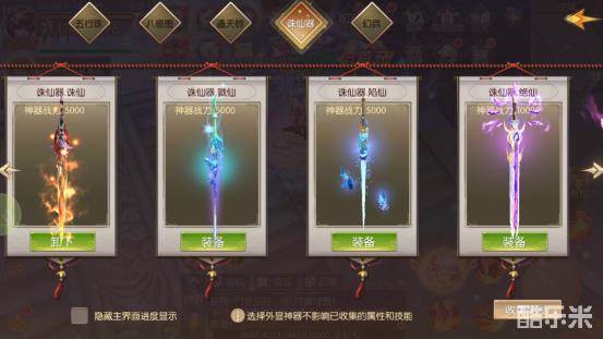 神器分为五行珠、八极图、通天铃、诛仙剑、幻兵五大类型,每件神器都具有独特的造型,收集之后,可以根据自己的偏好佩戴他们上阵。