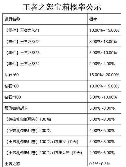 最大的可能就是和王者之怒一样,直接上架商城宝箱,这样的话,想要获取王者之力就需要参考以下的中奖概率: