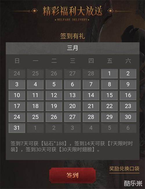 完成报名成为精英品鉴师后,就可以通过活动页面的签到,享受游戏特别备上的众多厚礼。需要注意的是,必须报名并且通过答题考验成为精英品鉴师才能参与签到等界面活动。其中在累计签到至7天时即可领取188钻石,14天时就可获得7天限时时装。玩家若连续签到满30天,更可以享用限时30天的限时翅膀,来一场帅气奢华的变身。