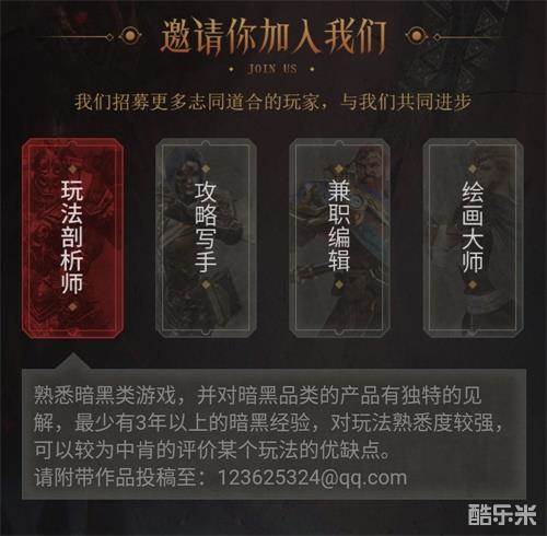 另外,为了丰富暗黑世界的厚度,延伸出更多的精彩,《拉结尔》也在此活动中面向广大玩家进行了职位招募。若玩家熟悉暗黑类游戏,并对暗黑品类的产品有独特的见解,即可报名玩法剖析师,与《拉结尔》共同成长。若玩家善于深挖系统、玩法等内容,亦或是善于PS、手绘等软件的运用,也可以报名攻略写手和绘画写手,为暗黑世界的精彩添砖加瓦。此外,玩家还可以报名兼职编辑,对投稿内容进行审核并制定等级,打造流畅的审核机制,塑造更加完美地暗黑世界。