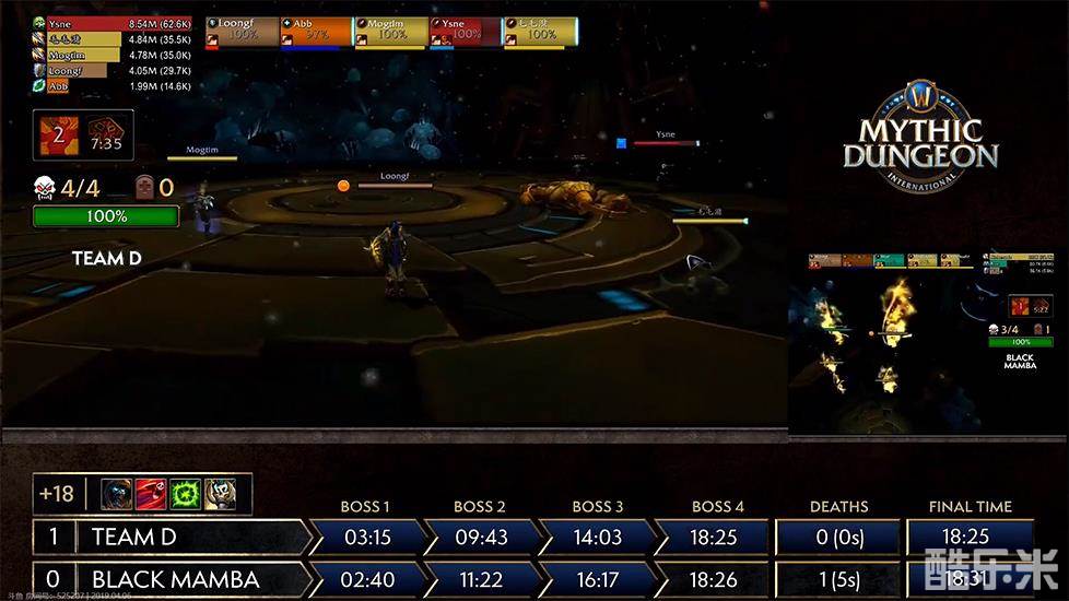 胜者组第二场,Team D对阵Black mamba,首张地图阿塔达萨,Team D 选择使用邪DK。Black mamba开局出现失误减员3人,Team D在处理小怪上细节完美,一路顺风顺水。Black mamba在boss3前black manba拉了4条龙一起打,开始激进战术。Boss3处,Team D拉到多波怪后邪DK打出了接近40W的秒伤,进度大幅领先,随后影遁直接到boss4前迅速打掉,先赢一分。