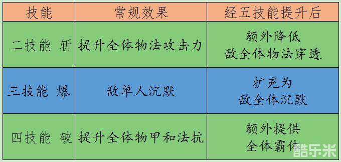 点评:阿保的五技能是对二三四技能效果的进一步提升,但其方式并不是直接提升,而是根据当前状况,随机为其中一个技能附加额外的效果。而无论是降低敌人物法穿透抑或全体沉默都是很实用的,尤其为四技能附加的全体霸体效果,更是极具价值。只不过相比巴尔托洛梅奥和薇薇而言,这个效果的稳定性稍有逊色罢了。另外,五技能还能为阿保额外提升1600点物甲,对阿保的生存而言有一定积极意义。