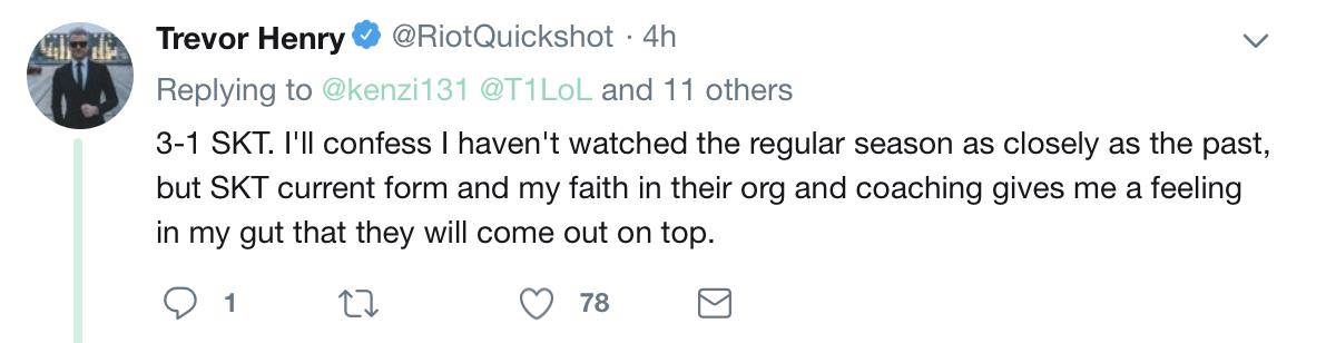 拳头解说Quickshot:3-1,SKT赢。坦白说这个常规赛我并没有像以前那样一直在关注,但是SKT现在的状态以及我对该俱乐部和教练组的信心让我有种直觉,他们会重回巅峰