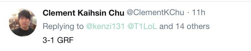 LPL英文流解说Hysterics:3-2,SKT赢。SKT对阵KZ时的打法让我认为这场比赛最后会归结为一个瞬间,这个瞬间很有可能出现在史诗级的第五局中。感觉目前SKT比起Griffin在长时间的比赛中更胜一筹