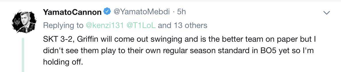 VIT教练Yamato:SKT3-2赢,Griffin会出现摇摆阵容并且纸面上是更强的队伍,但是我没有看到他们在bo5中表现出常规赛的实力,所以我不看好他们