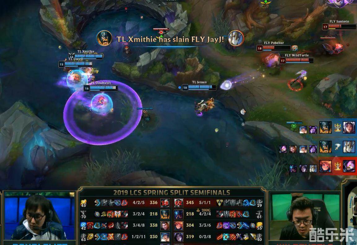 比赛中期时,FLY战队5/0的艾瑞莉娅配合加里奥切TL的后排,但在琴女+宝石的双回血下,几乎无伤就将两人击杀,TL也是稳稳的拿下第一局比赛的胜利。