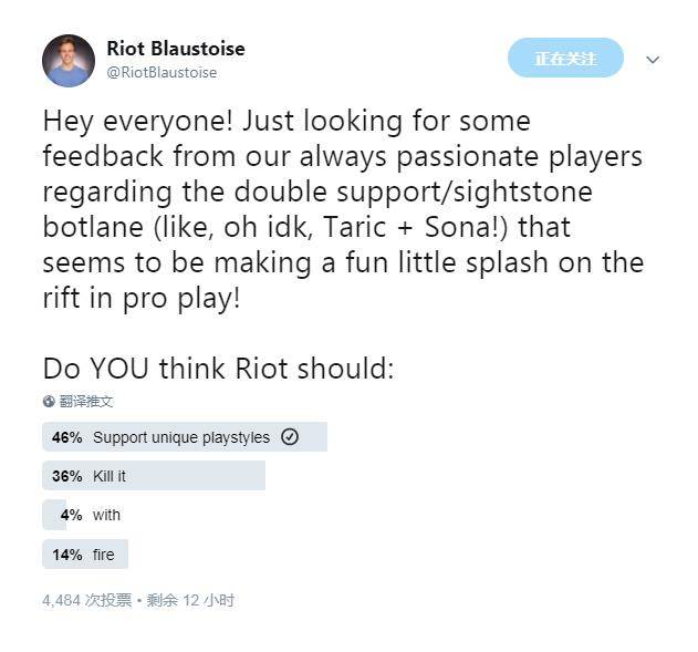 比赛结束之后,Riot设计师Blaustoise就在推特上就双辅助下路的套路展开了投票讨论。