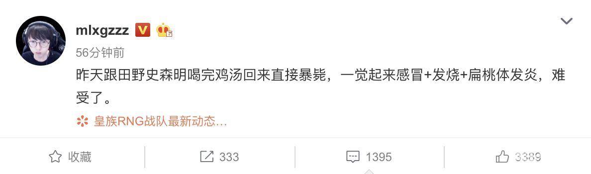英雄联盟MLXG透露身体近况 喝个鸡汤直接生病