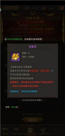 最后给大家介绍一下这个活动的隐藏玩法,迎春花,虽然可以兑换宝箱和福袋,但是直接使用能够获得1000点经验,杀一个BOSS,最少都能获得80个迎春花。我认真计算了一下,如果玩家足够勤快,一天打100个BOSS,那么就能获得将近一万个迎春花,也就是1000万经验。