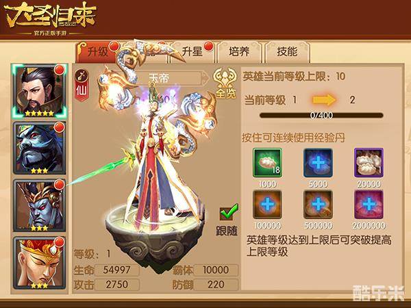 大家以为玉帝大人这么强,就是他的极限了么?当然不可能,作为天庭第一“大腿”,玉帝大人和别的英雄一样,也还有成长空间。玩家们只要能成功抱上他的大腿,无论是想看副本妖怪被虐还是想看竞技场对手哀嚎,都不成问题!为玉帝大人提升一下等级和资质,还会有更多强大技能陆续解锁哦。