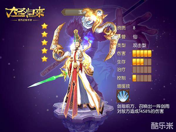 五星英雄攻高血厚的特点咱们不说也罢,看看咱们玉帝陛下全部点亮的伤害表,相信玩家们都能理解这代表着什么。这样高伤型英雄,增援技更是酷炫。用剑直指前方就能召唤剑雨带走一波敌人。有这样的强者压阵,玩家们体验一把“神队友”待遇可就不是梦了。