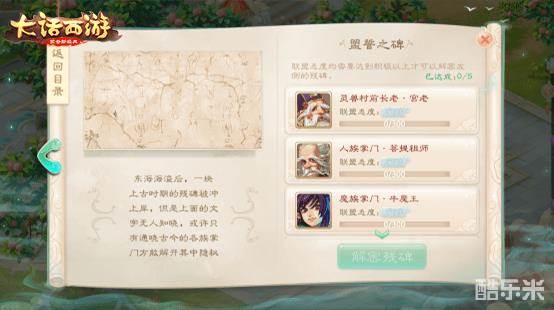东海海溢之后,一块上古时期的残碑被冲上海岸,然而碑上书写的文字却无人知晓,似乎只有通晓古今的各族掌门才能解锁其中奥秘。,当四族首领及灵兽村前长老的联盟态度到达一定程度之后,玩家才能解锁神秘的“盟誓之碑”。届时,全民将携手解译碑文,共同探寻未知的秘密。