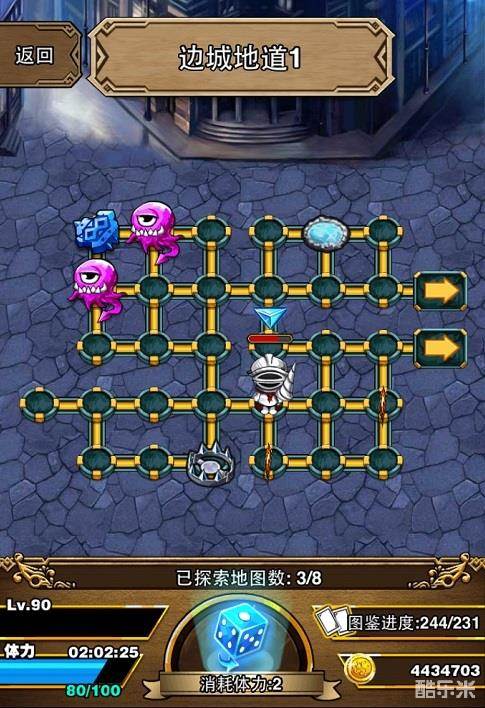在地下城中需要通过掷骰子才能前进,有点像大富翁的方式。而地下城中布满陷阱和怪物,在选择下一步的时候一定要小心啊。一个地下城中会有多张地图,每张地图的出口也是不同的,选择一个好的出口能帮你快速抵达BOSS所在的地图。否则很可能还没见到BOSS,就一命呜呼了。