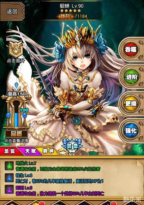 天赋并不是武将一开始就能够使用的,每个天赋的获得都是需要通过武将进阶来完成的。通过进阶获得天赋以后,会让武将变得更加强大。在战斗中,当武将施放一些比较变态的主动天赋是那可是相当过瘾啊!例如:即死这个天赋是在武将普通攻击前,会使敌方任意一个武将有一定几率的立刻死亡。是不是超级爽呢!