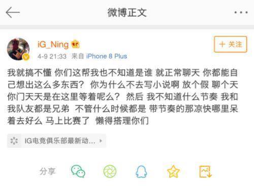 IG打野ning的回应如下,表示自己不明白为什么突然这么多节奏?我们只是正常聊天,为什么会有人联想到这么多东西?就是放个假聊个天,为什么有人带节奏?我和我队友都是兄弟,带节奏的一边去,懒得搭理你们。
