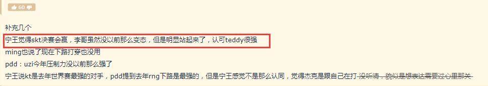 对于这一次LCK决赛来说,宁王觉得SKT应该会赢,尽管Faker能力没有以前那么变态了,上赛季一度陷入低迷期,但是本赛季明显站起来了。另一方面就是SKT的下路Teddy非常强,看来宁王还是非常看好老机长的!