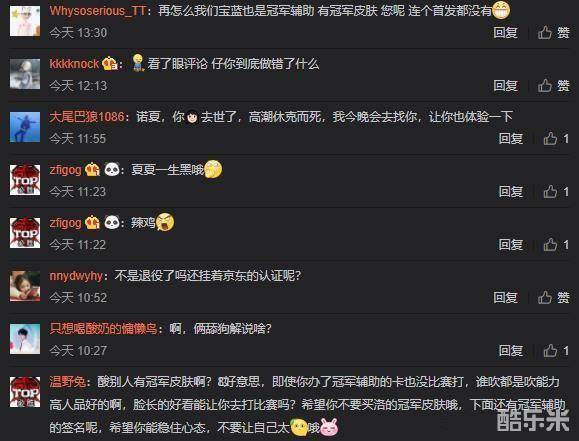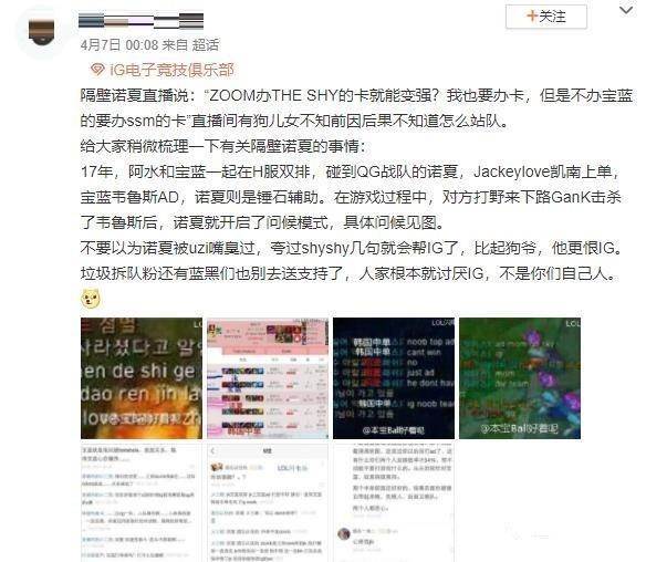 所以这次的事情加上之前的恩怨,也让不少IG粉丝非常生气,感觉诺夏就是故意在针对宝蓝。在诺夏的微博下方,已经有了一部分IG粉丝去爆破,直言宝蓝是冠军辅助有冠军皮肤,不像你连首发都没有,连比赛都没得打,希望你不要买洛的冠军皮肤,当然也有人直接人身攻击的,骂的难听的。