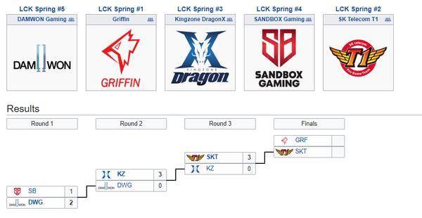 有新晋的SB和DWG两支队伍进入季后赛,新队伍的发展潜力还是很大的,但是老牌队伍KZ带来的压力也不小,直接零封DWG,风水轮流转,SKT以不错的状态零封KZ。接下来就是Griffin对阵SKT,将决胜出春季赛霸主,究极哪只队伍能够代表LCK赛区出战还未知。