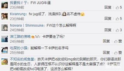 最令人意外的事情出现了,凌晨的时候Karsa再一次修改了自己的ID,这一次的ID非常直接,就是“FW JUG”,闪电狼打野。在来到RNG之前,Karsa一直是FW的核心,被称为狼王,为了获得更好的成绩于是离开了FW加入了RNG,如今Karsa改的这个ID是意味着要离开RNG回到FW了吗?